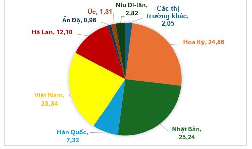5 tháng đầu năm 2023, Hoa Kỳ dẫn đầu khi chiếm 43% tổng thị phần toàn ngành trong khi Nhật Bản xếp thứ 2 với thị phần là 36,22%. Sang đến đầu năm nay, thị phần của Hoa Kỳ và Nhật Bản đều giảm mạnh xuống còn lần lượt là 24,86% và 25,24%. Việt Nam là quốc gia có sự tăng trưởng ấn tượng nhất về thị phần lên đến 23,34% trong 5 tháng đầu năm nay so với 2,17% cùng kỳ năm trước đó. Hà Lan là quốc gia có sự tăng trưởng tốt về thị phần chỉ sau Việt Nam khi tăng đến 6,65% so với cùng kỳ năm trước đó, giúp quốc gia này tăng thị phần lên 12,10% trong 5 tháng đầu năm nay.
