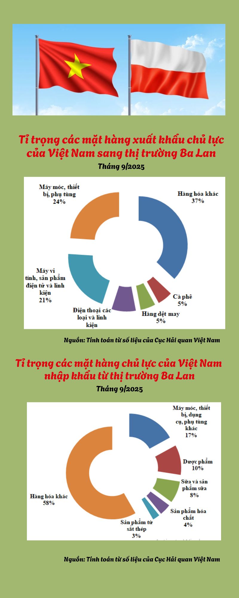 Theo số liệu thống kê của Cục Hải quan Việt Nam, 9 tháng đầu năm 2025, trao đổi thương mại 2 chiều giữa Việt Nam và Ba Lan đạt hơn 2,9 tỉ USD, trong đó xuất khẩu của Việt Nam sang Ba Lan đạt gần 2,58 tỉ USD, và nhập khẩu hàng hóa của Việt Nam từ Ba Lan đạt trên 339 triệu USD, Việt Nam đạt thặng dư 2,24 tỉ USD.