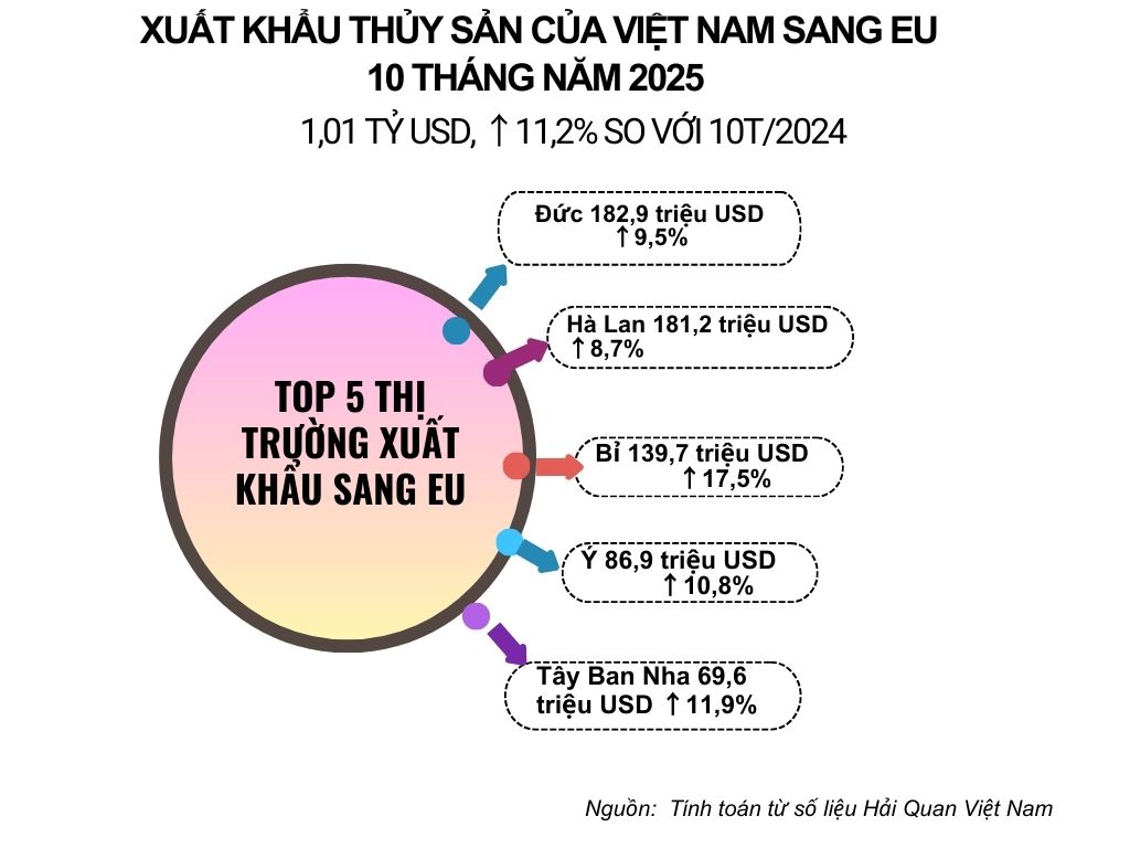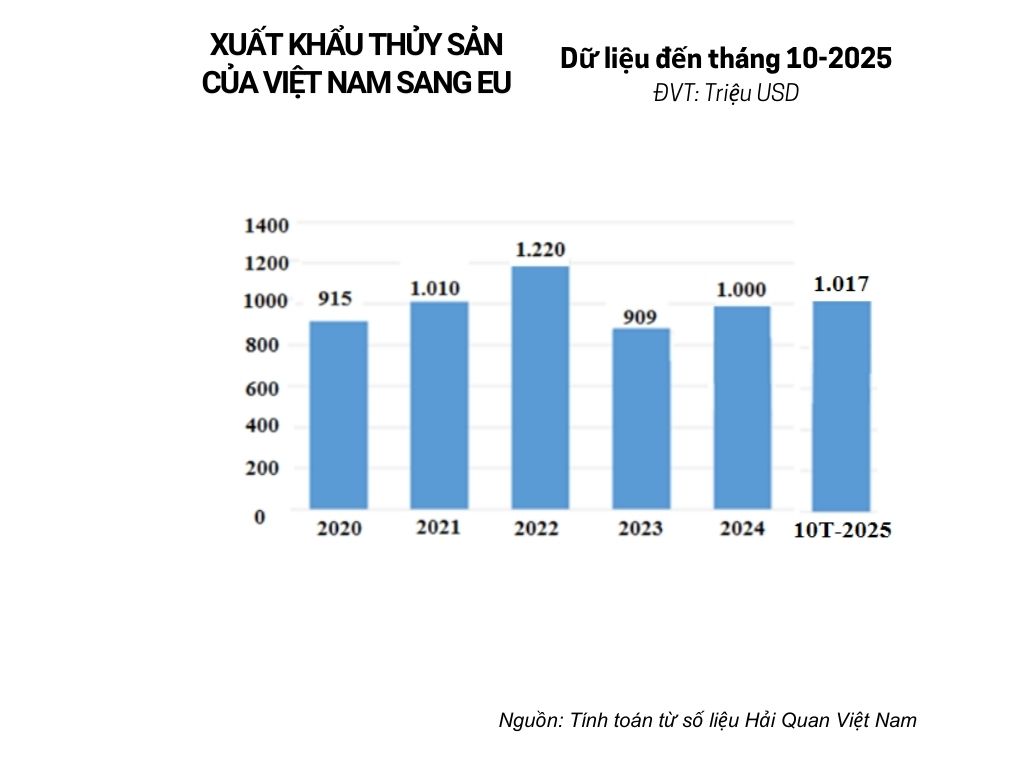 Theo số liệu của Cục hải quan Việt Nam, trong 10 tháng năm 2025, xuất khẩu thủy đạt 9,32 tỷ USD, tăng 13,07% so với cùng kỳ năm trước. Trong đó, xuất khẩu sang thị trường EU đạt đạt 1,01 tỷ USD, tăng 11,2% so với cùng kỳ 2024, chiếm 10,9% trong tổng kim ngạch xuất khẩu thủy sản của Việt Nam.