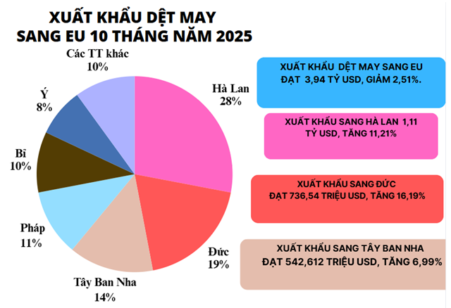 Tính chung trong 10 tháng năm 2025, hàng dệt may của Việt Nam xuất khẩu sang Hà Lan nhiều nhất trên 1,11 tỷ USD, chiếm 28,22% trong tổng kim ngạch xuất khẩu hàng dệt may sang EU; Xuất khẩu sang Đức đạt trên 736,54 triệu USD, tăng 16,19%, chiếm 18,72%.