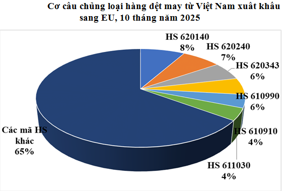 Theo tính toán từ số liệu thống kê hải quan của Việt Nam, xuất khẩu hàng dệt may của Việt Nam sang EU tháng 10/2025 tăng 1,7% so với tháng 9/2025 nhưng giảm 2,85% so với tháng 10/2024, đạt trên 386,17 triệu USD. Tính chung 10 tháng năm 2025 xuất khẩu hàng dệt may sang EU giảm 2,51% so với cùng kỳ năm 2024, đạt gần 3,94 tỷ USD.