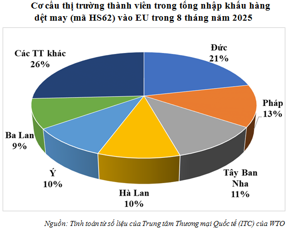 Trong số các đối tác thành viên trong EVFTA, trong tháng 10/2025, Việt Nam xuất hàng dệt may nhiều nhất sang các thị trường: Hà Lan (đạt gần 129,13 triệu USD), Đức (đạt trên 73,93 triệu USD), Tây Ban Nha (đạt gần 44,27 triệu USD), Pháp (đạt gần 44,2 triệu USD).