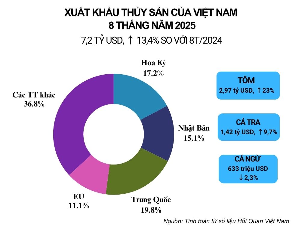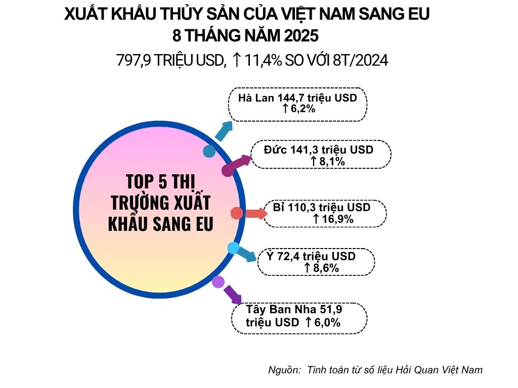 Theo số liệu của Cục hải quan Việt Nam, trong 8 tháng đầu năm 2025, xuất khẩu thủy sản đạt 7,2 tỷ USD, tăng 13,4% so với cùng kỳ năm trước. Trong đó, xuất khẩu sang thị trường EU đạt 797,9 triệu USD, tăng 23% so với cùng kỳ 2024, chiếm 11,1% trong tổng kim ngạch xuất khẩu thủy sản của Việt Nam.