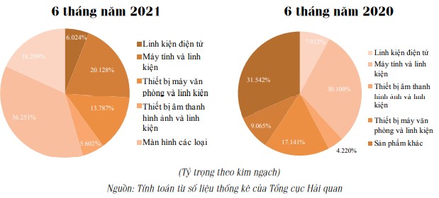 Trong 6 tháng đầu năm 2021, cơ cấu xuất khẩu chủng loại sản phẩm máy tính, sản phẩm điện tử và linh kiện của Việt Nam sang EU đã thay đổi theo hướng tích cực. Tỷ trọng xuất khẩu nhóm linh kiện điện tử đã giảm từ 8% trong 6 tháng đầu năm 2020, xuống còn 6%, trong khi tỷ trọng xuất khẩu màn hình các loại tăng từ 32%, lên 36%.