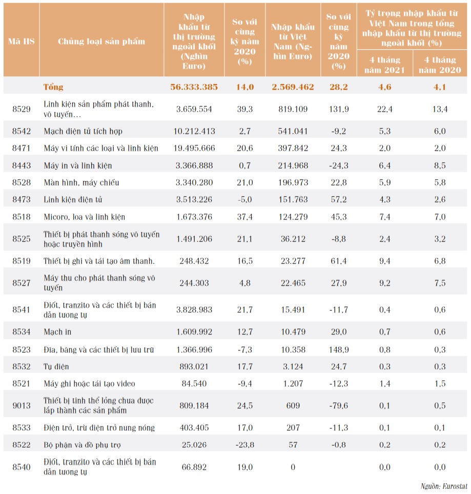 Triển vọng xuất khẩu máy vi tính, sản phẩm điện tử và linh kiện sang thị trường EU khả quan bởi nhu cầu tiêu thụ máy vi tính, sản phẩm điện tử và linh kiện tại khu vực cho tiêu dùng cá nhân và các ngành sản xuất công nghiệp đang phát triển như: ôtô, nhà thông minh, năng lượng, tự động hóa, chiếu sáng, y tế, dịch vụ lưu trữ dữ liệu... tăng. Trong các tháng đầu năm 2021, tiếp tục xu hướng của năm 2020, nhu cầu nhập khẩu máy vi tính, sản phẩm điện tử và linh kiện của EU tăng. Theo thống kê của Eurostat, nhập khẩu máy vi tính, sản phẩm điện tử và linh kiện của EU trong 4 tháng đầu năm 2021 từ thị trường ngoài khối đạt 56,3 tỷ USD, tăng 14% so với cùng kỳ năm 2020. Trong đó, nhập khẩu từ Việt Nam đạt tốc độ tăng trưởng cao hơn, tăng 28,2%. Thị phần nhóm hàng này của Việt Nam trong tổng nhập khẩu từ thị trường ngoài khối của EU tăng từ 4,1% trong 4 tháng đầu năm 2020, lên 4,6% trong 4 tháng đầu năm 2021. Trong đó, thị phần các sản phẩm với mã HS 8529, 8443, 8473, 8519, 8527 của Việt Nam trong tổng nhập khẩu từ thị trường ngoài khối của EU 4 tháng đầu năm 2021 tăng so với cùng kỳ năm 2020.