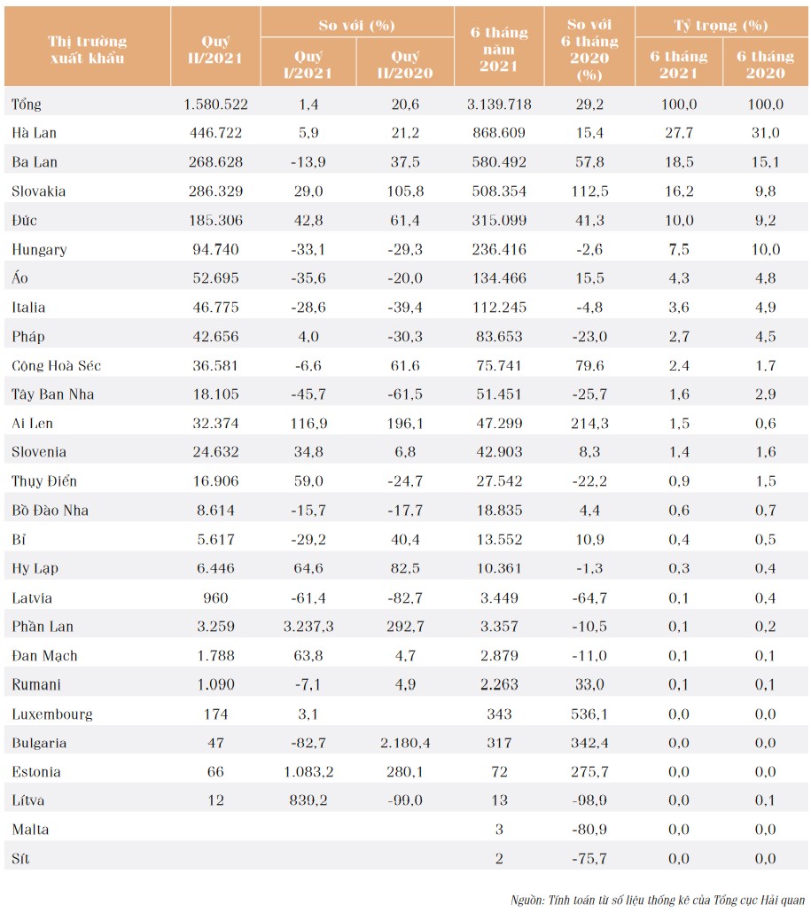 Trong khối EU, sản phẩm máy vi tính, sản phẩm điện tử và linh kiện của Việt Nam chủ yếu được xuất khẩu vào các thị trường: Hà Lan, Ba Lan, Slovakia, Đức, Hungary, Áo và Italia. Trong đó, xuất khẩu sang thị trường Hà Lan, Ba Lan, Đức tăng trưởng khả quan so với cùng kỳ năm 2020. Các thị trường tại Tây Âu vẫn là những thị trường tiêu dùng điện tử lớn nhất ở châu Âu do quy mô dân số, tiềm năng kinh tế và nhu cầu ở mức cao.