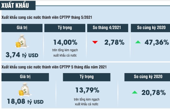 Báo cáo xuất khẩu sang các nước CPTPP trong tháng 5 năm 2021 tăng trưởng gần 50% so với cùng kỳ năm ngoáiChủ Nhật, 20/06/2021