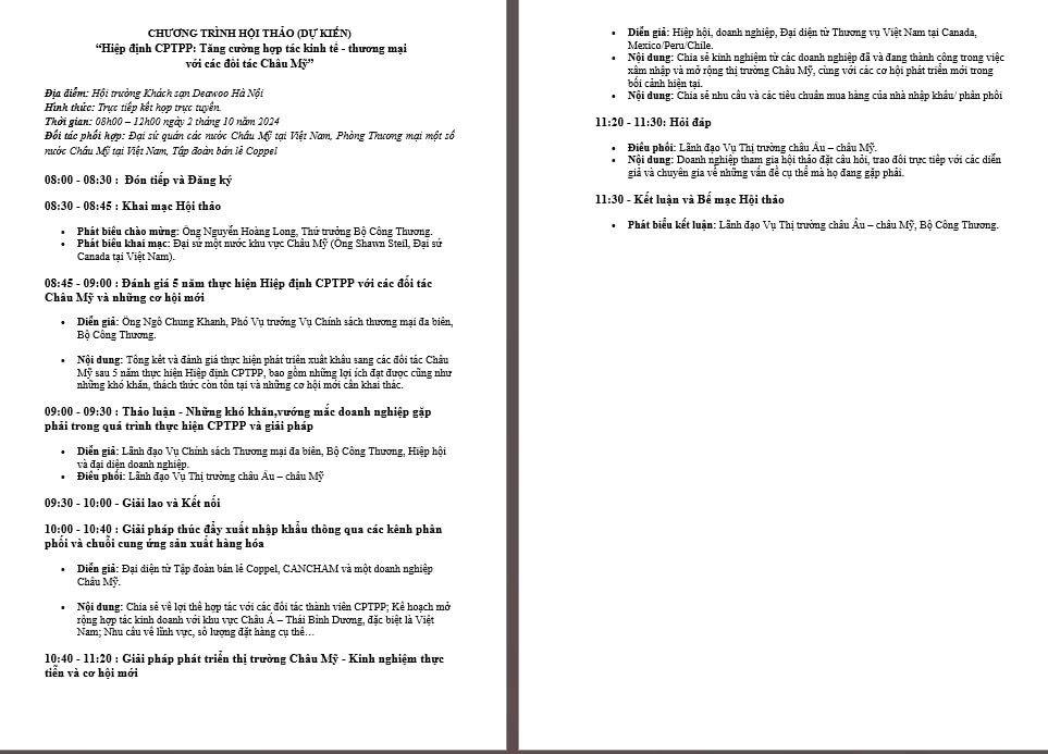 Thực hiện Quyết định 2382⁄QĐ-BCT ngày 05 tháng 9 năm 2024, Bộ Công Thương giao Vụ Thị trường châu Âu – châu Mỹ chủ trì, phối hợp với các đơn vị tổ chức Hội thảo quốc tế “Hiệp định CPTPP: Tăng cường hợp tác kinh tế - thương mại với các đối tác Châu Mỹ”.