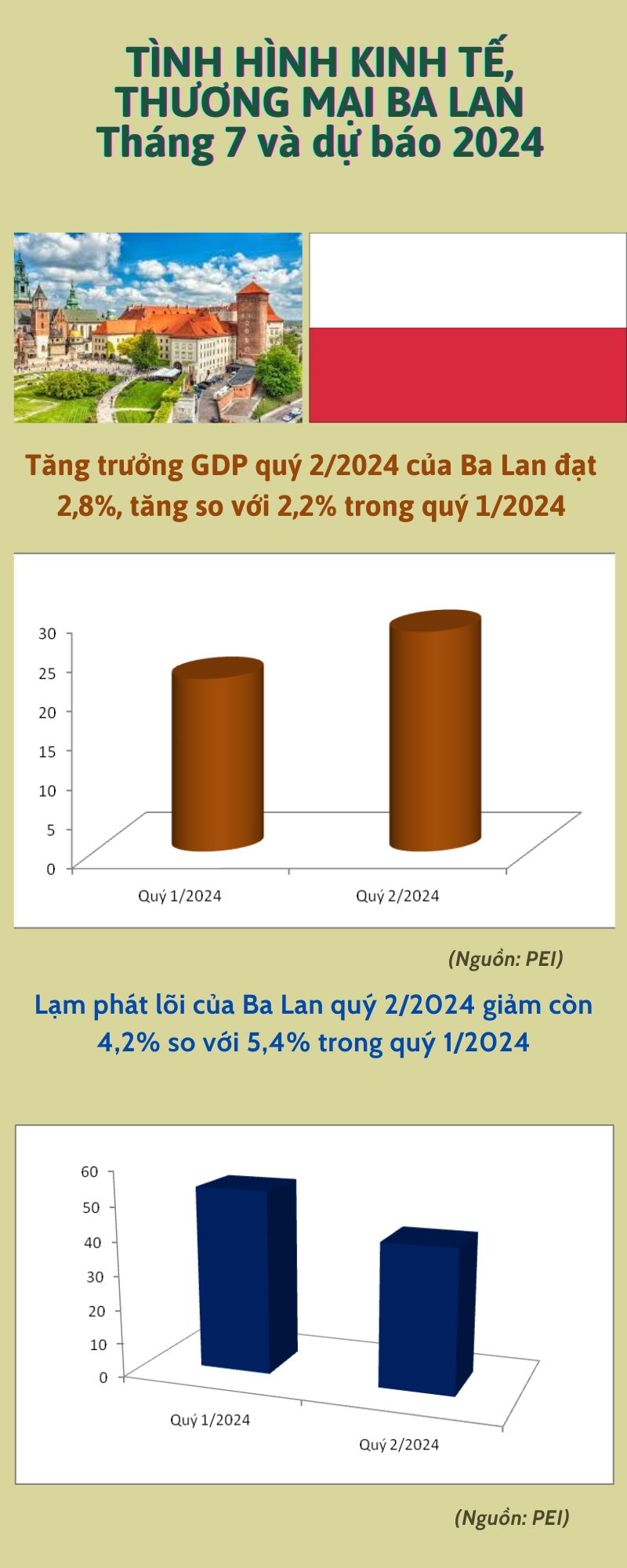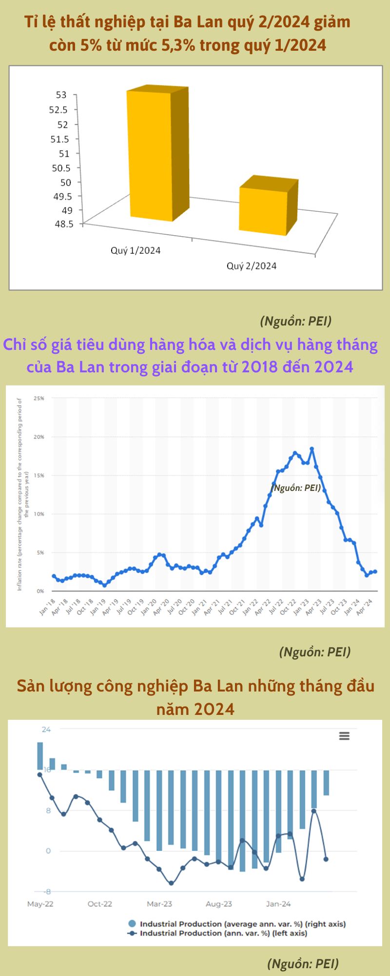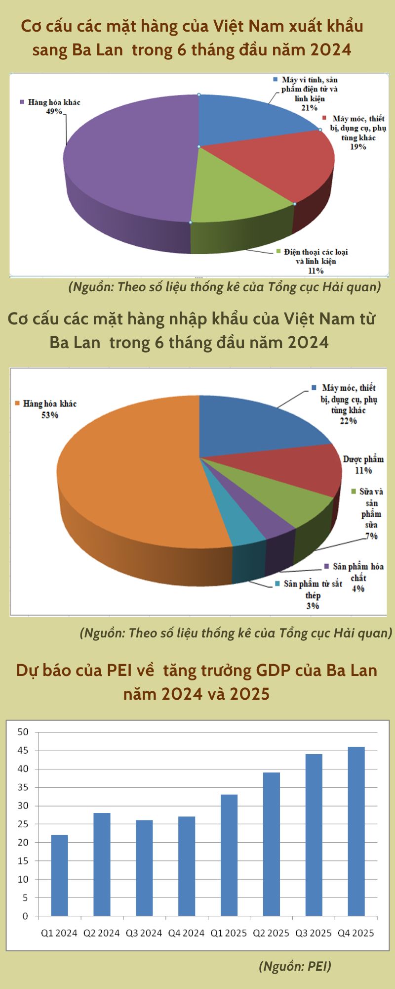 Theo số liệu thống kê của Tổng cục Hải quan Việt Nam, trong 6 tháng đầu năm 2024, xuất khẩu hàng hóa của Việt Nam sang thị trường Ba Lan đạt 1,44 tỉ USD, tăng 22,81% so với cùng kỳ năm 2023 và nhập khẩu hàng hóa của Ba Lan từ Việt Nam đạt 191,52 triệu USD, tăng 16,3% so với cùng kỳ năm 2023.
