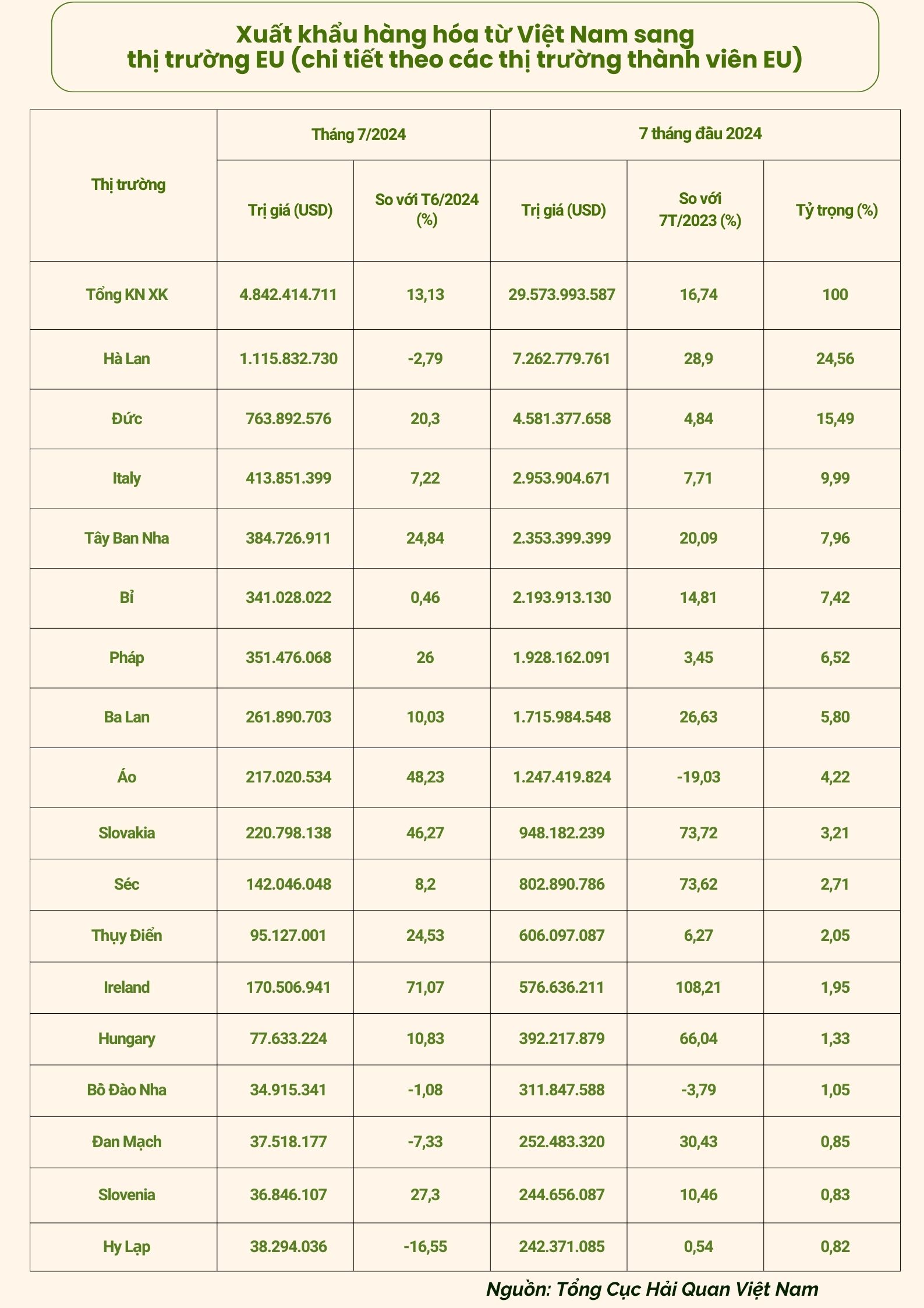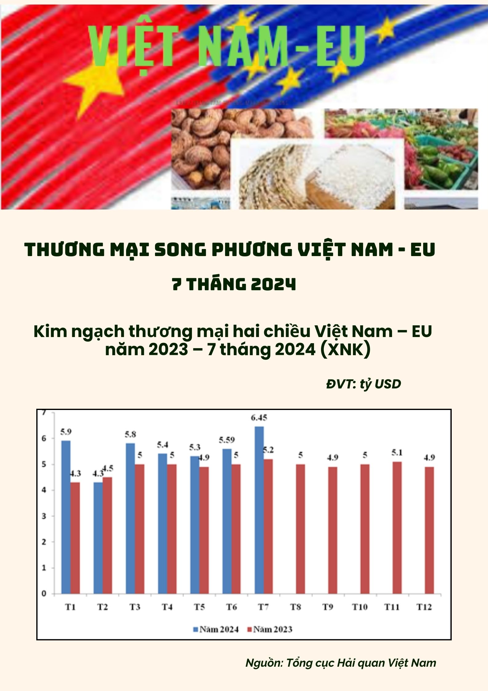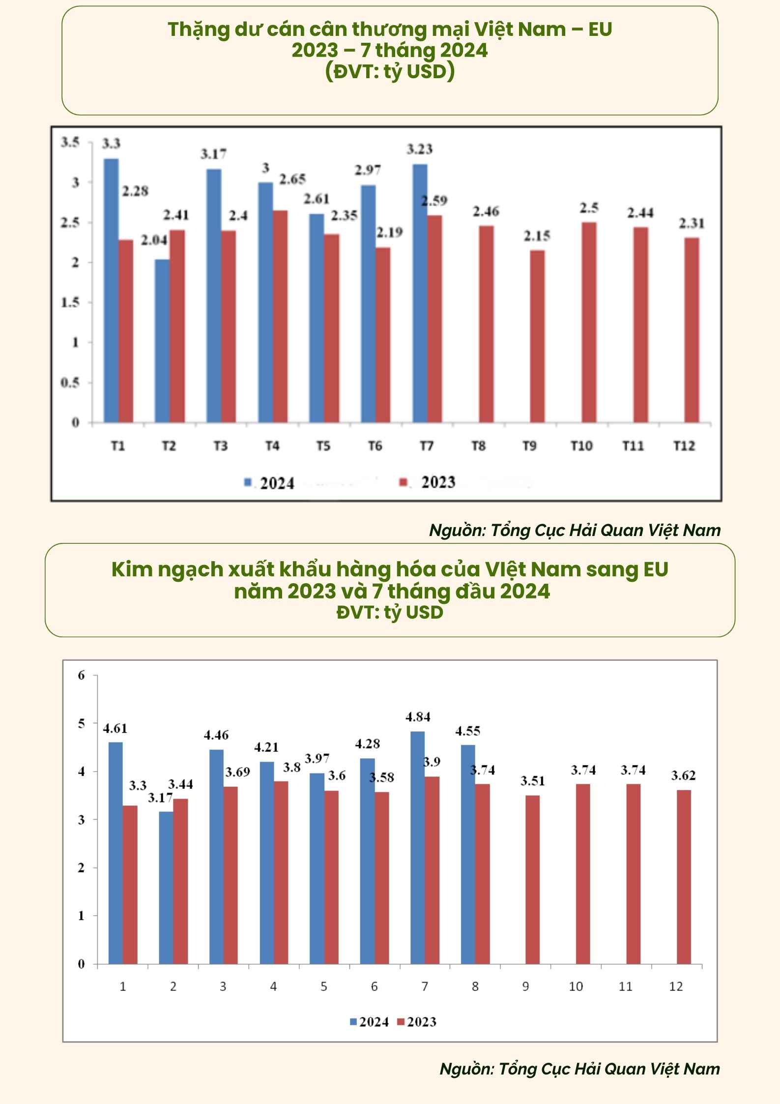 Kim ngạch xuất khẩu hàng hóa từ Việt Nam sang EU đạt trên 29,57 tỷ USD, tăng 16,74% so với cùng kỳ năm 2023. Trong đó, có 4 nhóm hàng đạt trên 2 tỷ USD là Máy vi tính, sản phẩm điện tử và linh kiện; điện thoại và linh kiện; máy móc, thiết bị, dụng cụ, phụ tùng và giày dép các loại.