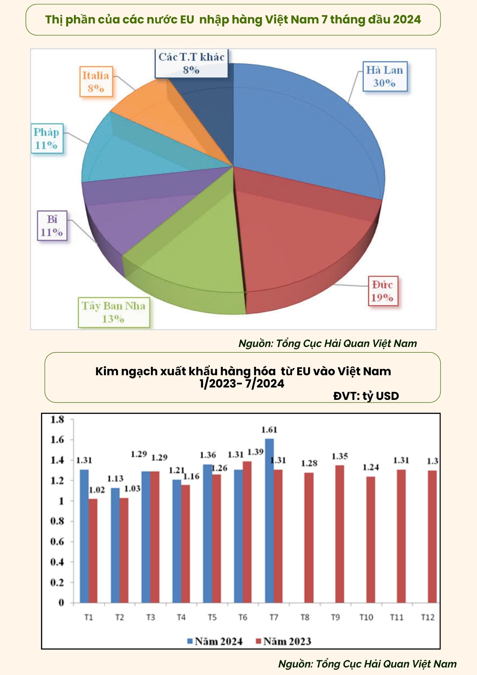 Kim ngạch nhập khẩu hàng hóa từ EU vào Việt Nam đạt trên 9,31 tỷ USD, tăng 10% so với cùng kỳ năm 2023. Có 3 nhóm hàng nhập khẩu từ EU đạt kim ngạch trên 1 tỷ USD là Máy vi tính, sản phẩm điện tử và linh kiện; Máy móc, thiết bị, dụng cụ, phụ tùng và Dược phẩm.