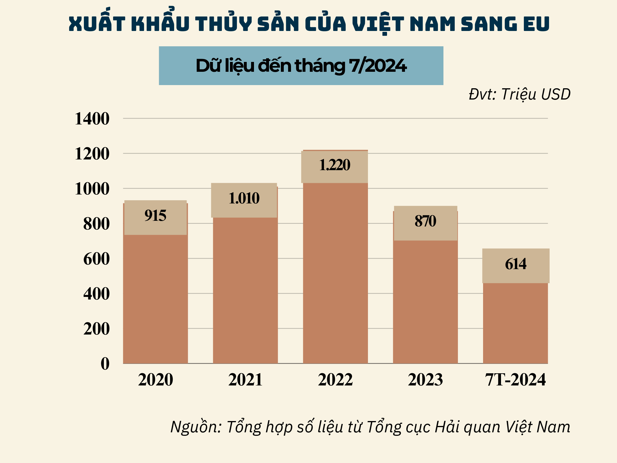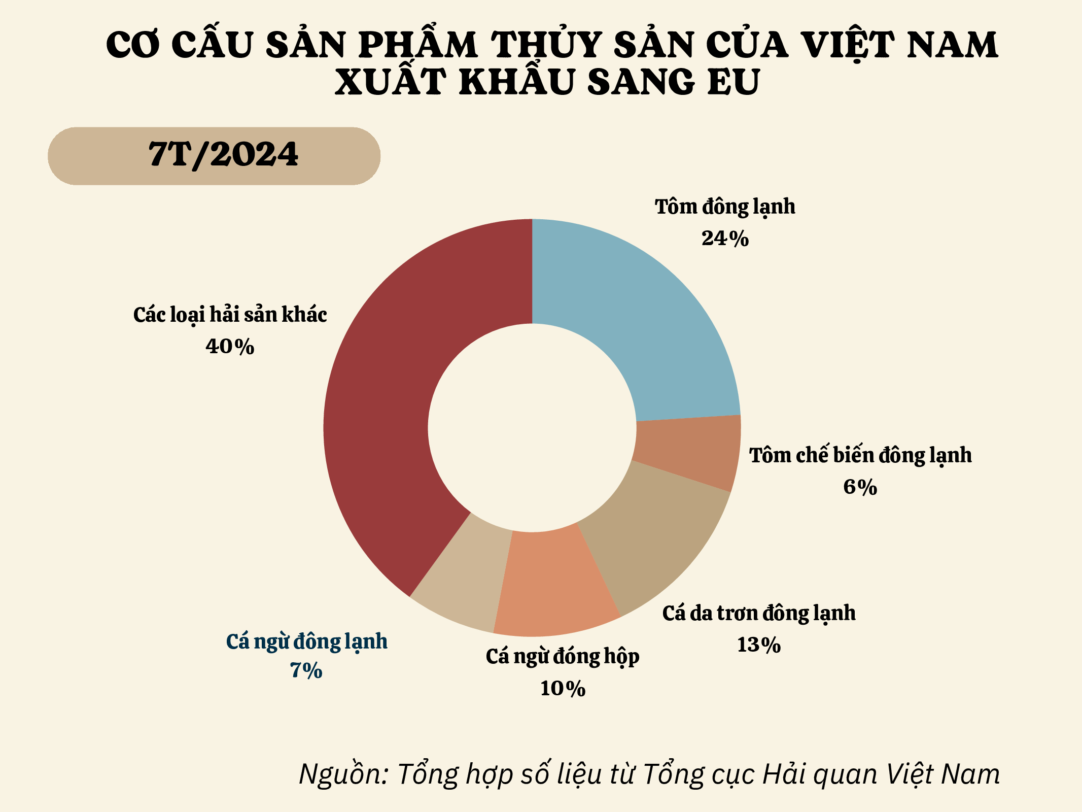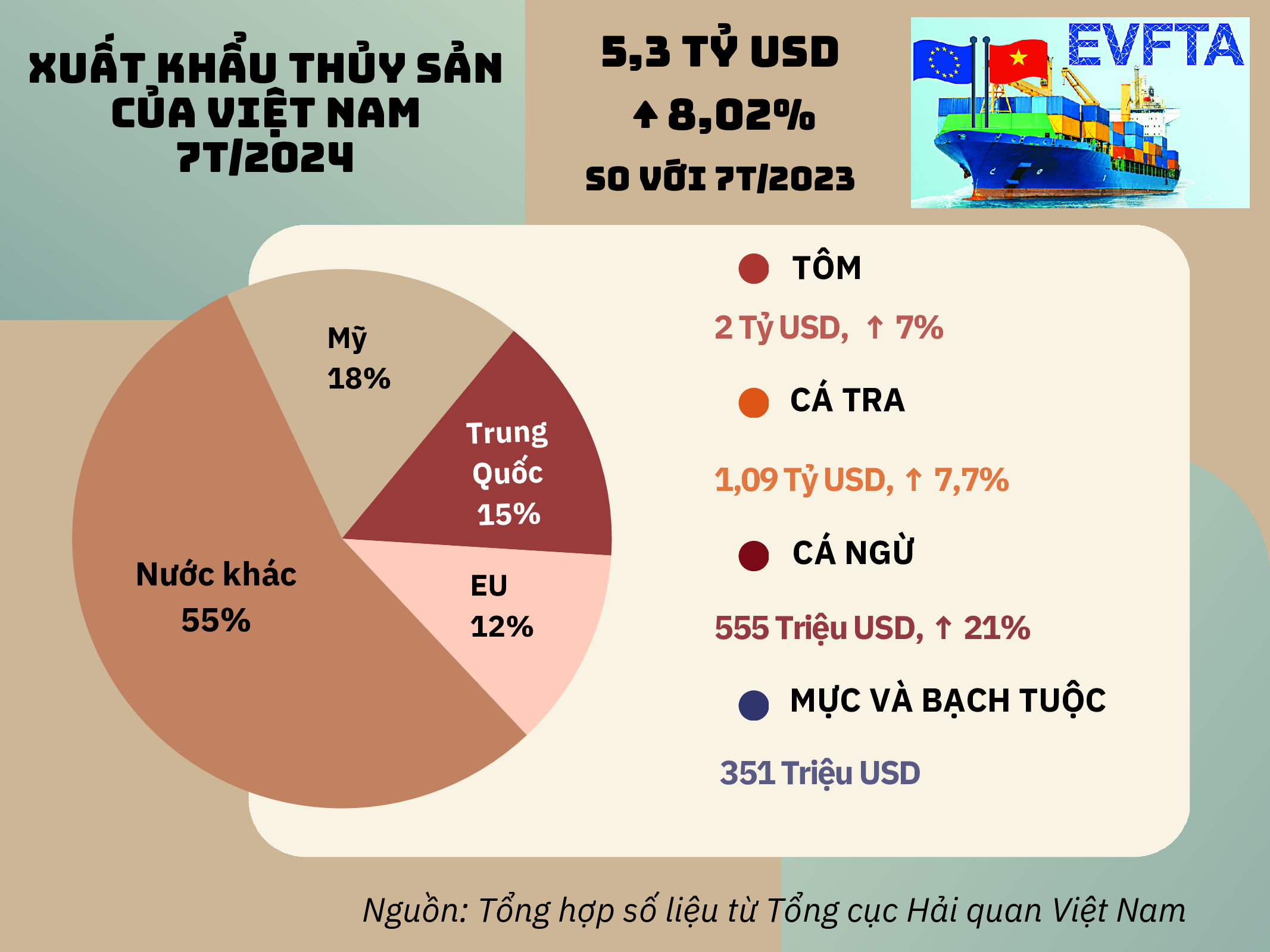 Kim ngạch xuất khẩu thủy sản vào EU giảm nhẹ trong tháng 7/2024, giảm 2,2% so với tháng 6/2024.