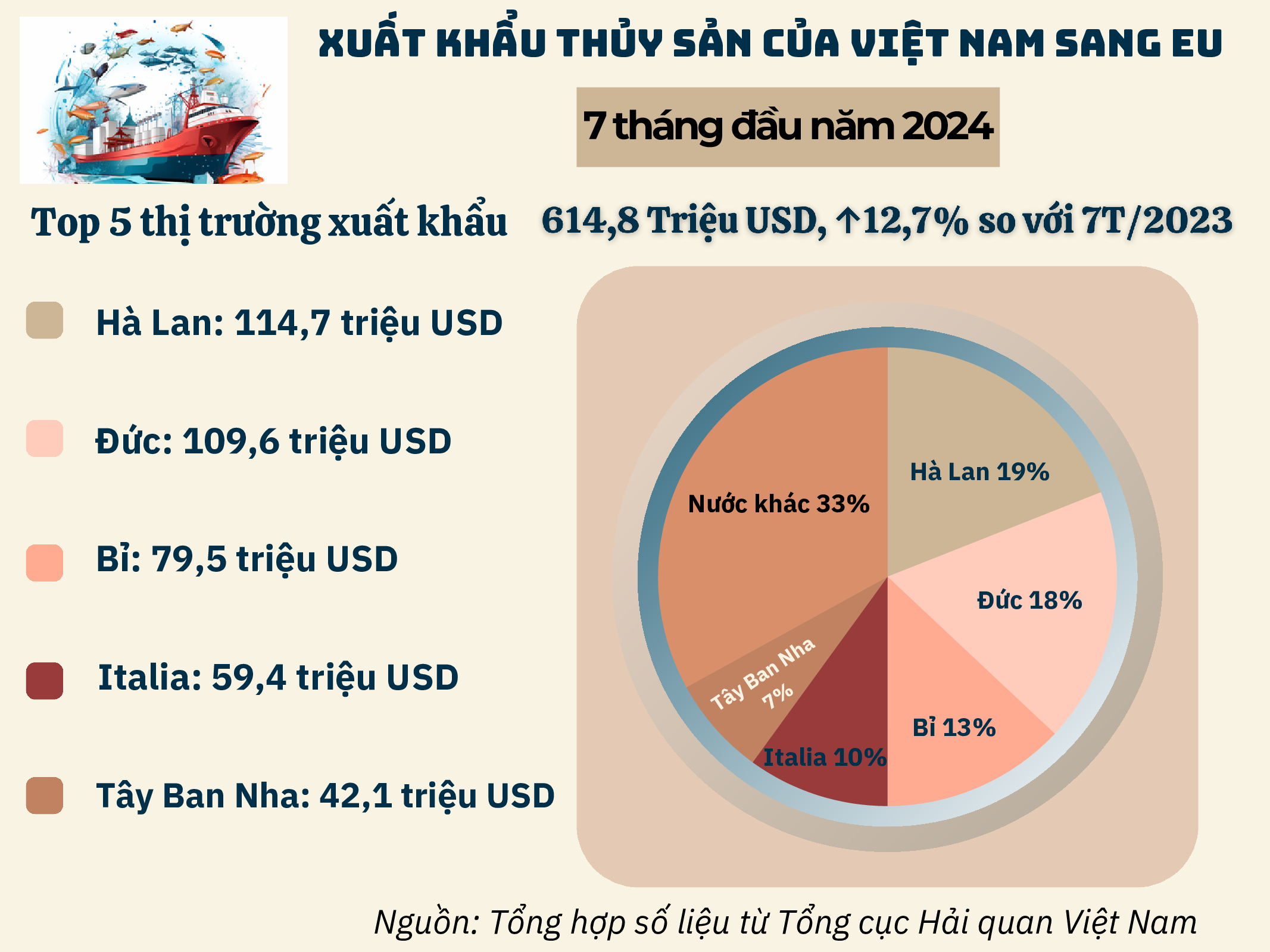 Hà Lan là thị trường đứng đầu trong khối EU về trị giá nhập khẩu mặt hàng thủy sản của Việt Nam, đạt 114,7 triệu USD, tăng 8,6% so với cùng kỳ, chiếm tỷ trọng 18,6% trong tổng kim ngạch nhập khẩu mặt hàng này của thị trường EU.