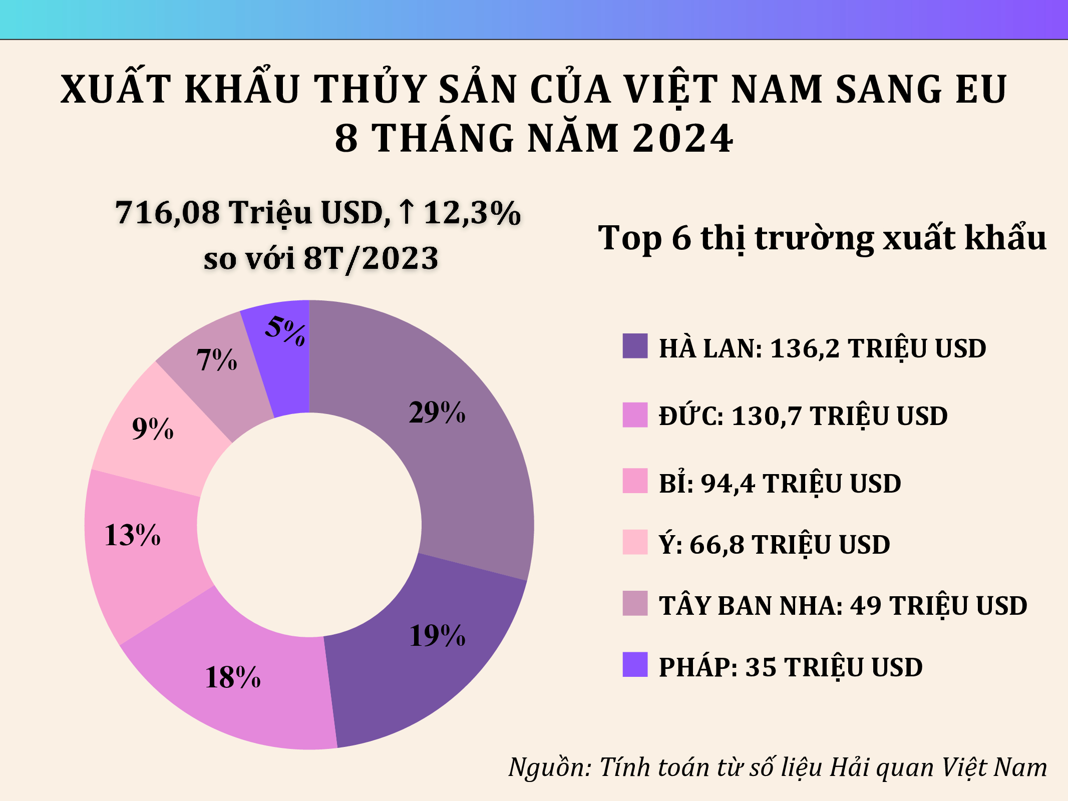Theo số liệu của Tổng cục Hải quan Việt Nam, trong 8 tháng đầu năm 2024, xuất khẩu thủy đạt 6,3 tỷ USD, tăng gần 9% so với cùng kỳ năm trước. Trong đó, xuất khẩu sang thị trường EU đạt 716,08 triệu USD, tăng 12,3% so với cùng kỳ 2023, chiếm 11,3% trong tổng kim ngạch xuất khẩu thủy sản của Việt Nam. Hà Lan là thị trường đứng đầu trong khối EU về trị giá nhập khẩu mặt hàng thủy sản của Việt Nam, đạt 136,1 triệu USD, tăng 12,2% so với cùng kỳ, chiếm tỷ trọng 19% trong tổng kim ngạch nhập khẩu mặt hàng này của thị trường EU. Về chủng loại sản phẩm, xuất khẩu thủy sản của Việt Nam sang EU chủ yếu vẫn là tôm, cá da trơn,… Các mặt hàng xuất khẩu thủy sản chủ lực đều ghi nhận sự tăng trưởng mạnh mẽ tại thị trường EU. Tuy nhiên, ngành thủy sản vẫn còn đối mặt với nhiều thách thức như thẻ vàng IUU và các biện pháp phòng vệ thương mại. Thông thường, kể từ đầu quý IV/2024 trở đi, các nhà nhập khẩu tăng cường mua vào để chuẩn bị nguồn hàng cung ứng cho các dịp lễ, Tết cuối năm.