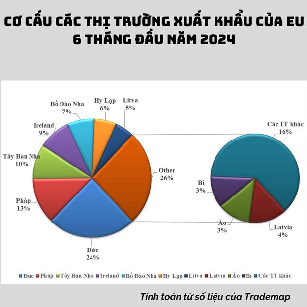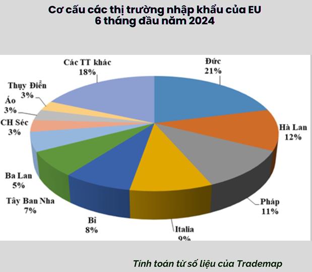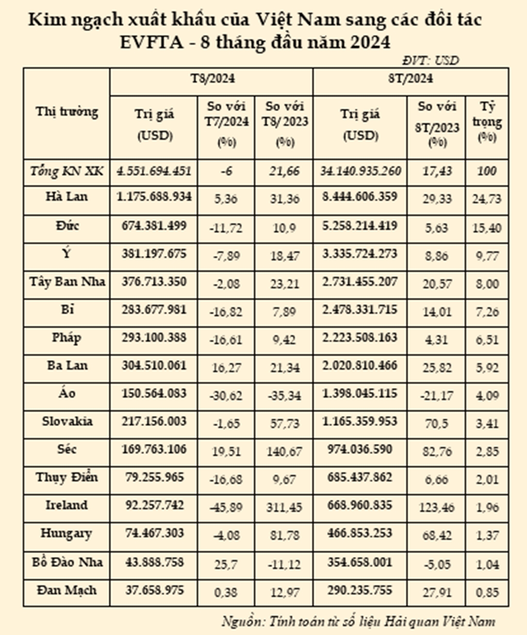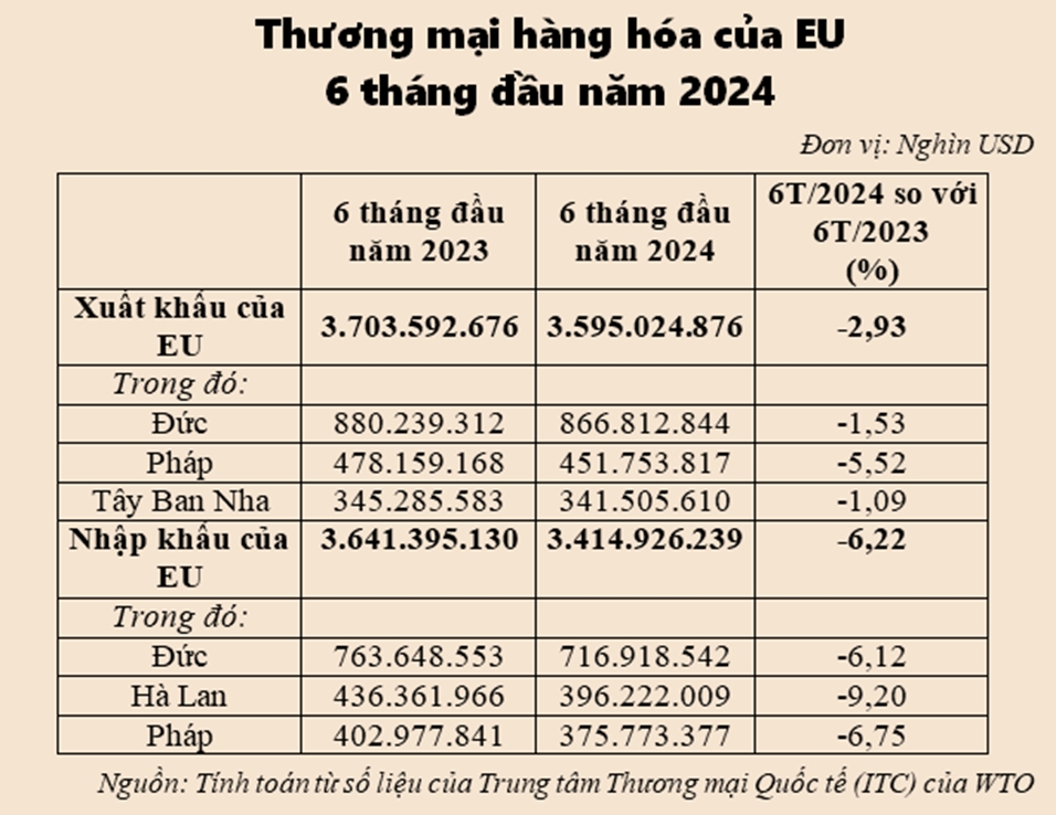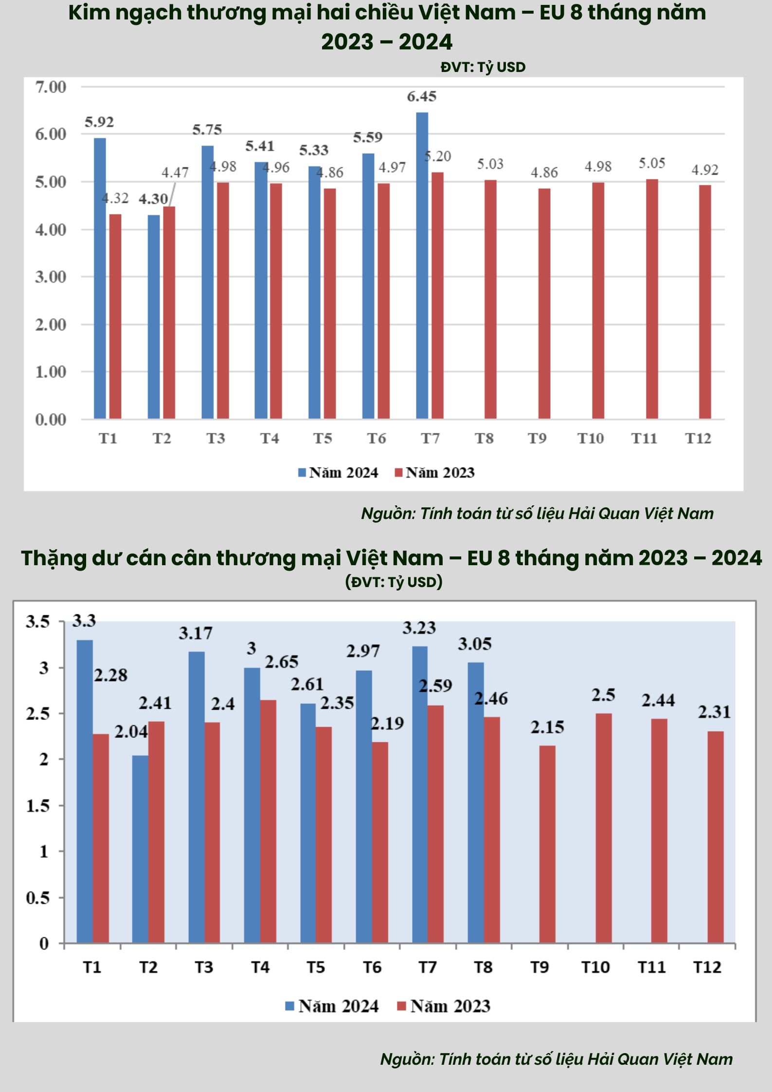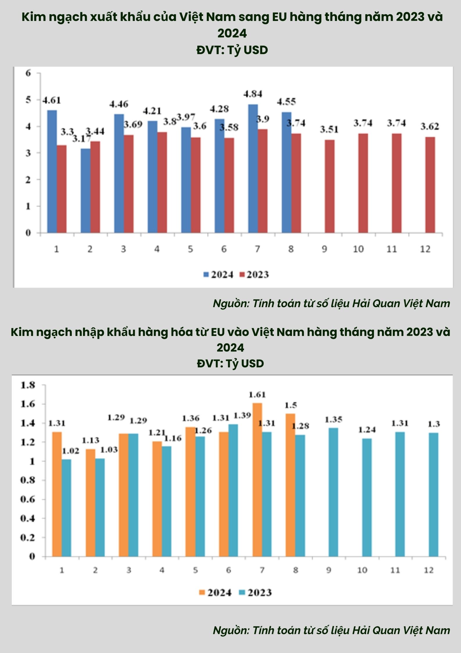Theo Trung tâm thương mại quốc tế (ITC) của WTO, nhập khẩu hàng hóa của EU 6 tháng đầu năm 2024 đạt 3.415 tỷ USD, giảm 6,22% so với cùng kỳ năm 2023. Trong khi đó, xuất khẩu hàng hóa của khối này đạt 3.595 tỷ USD, giảm 2,93%. Theo tính toán từ số liệu Hải quan Việt Nam, kim ngạch xuất nhập khẩu hàng hóa 2 chiều giữa Việt Nam và EU trong tháng 8/2024, đạt trên 6 tỷ USD, giảm 6% so với tháng 7/2024. Trong tháng 8/2024, Việt Nam xuất siêu sang EU 3,1 tỷ USD, giảm 5,7% so với tháng 7/2024. Tám tháng năm 2024, Việt Nam xuất siêu sang EU gần 23,33 tỷ USD, tăng 20,64% so với cùng kỳ 2023. Kim ngạch xuất khẩu hàng hóa của nước ta sang EU trong tháng 8/2024 đạt trên 4,55 tỷ USD, giảm 6% so với tháng 7/2024 và tăng 21,66% so với tháng 8/2023. Tính chung trong 8 tháng đầu năm 2024, con số này đạt trên 34,14 tỷ USD, tăng 17,43% so với cùng kỳ năm 2023. Hầu hết các mặt hàng xuất khẩu chủ lực đều tăng kim ngạch so với cùng kỳ năm 2023. Kim ngạch nhập khẩu hàng hóa từ EU vào Việt Nam trong tháng 8/2024 đạt gần 1,5 tỷ USD, giảm 6,7% so với tháng 7/2024 và tăng 17% so với tháng 8/2023. Tính chung trong 8 tháng đầu năm 2024, con số này đạt trên 10,81 tỷ USD, tăng 11% so với cùng kỳ năm 2023.