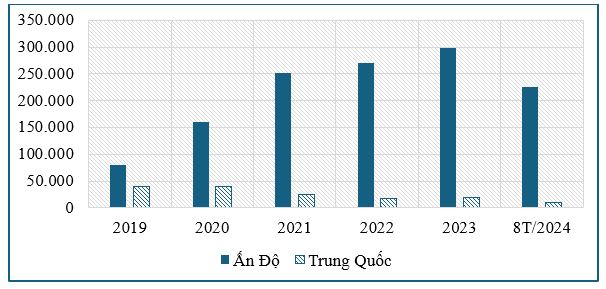Hiện nay trong số các thị trường ngoại khối thì Ấn Độ đang dẫn đầu về thị phần với 5,93% trong năm 2023 và 6,67% trong 8 tháng năm 2024, tiếp theo là Trung Quốc và UAE. Đáng lưu ý là trong khi thị phần nhập khẩu từ Trung Quốc liên tục sụt giảm trong giai đoạn 2019-2024 thì thị phần của 2 thị trường ở châu Á khác là Ấn Độ và Việt Nam gia tăng (xem biểu đồ dưới).