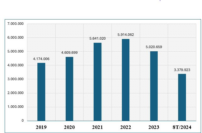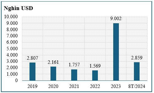 Bước sang năm 2024, nhập khẩu tăng nhờ sức mua được cải thiện; tính từ đầu năm đến hết tháng 8 (tháng gần nhất có số liệu thống kê), trị giá nhập khẩu nhóm hàng này vào EU-27 đạt 3,379 tỷ USD, tương ứng với mức bình quân 422 triệu USD/tháng, cao hơn so với mức bình quân 418 triệu USD/tháng của năm 2023.