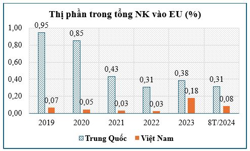 Biểu đồ 4: So sánh biến động thị phần của nhóm hàng HS 6907 nhập khẩu vào EU-27 từ Việt Nam và Trung Quốc giai đoạn 2019-2024