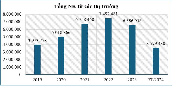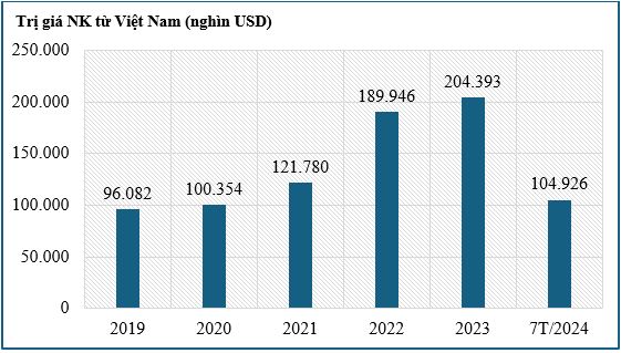 Trong quý 2/2024, nhập khẩu nhóm hàng này vào EU có sự phục hồi, tuy nhiên, tính chung 7 tháng năm 2024, EU nhập khẩu 3,5 tỷ USD nhóm hàng này từ các thị trường trên thế giới, với mức trung bình 511 triệu USD/tháng, vẫn thấp hơn mức trung bình 549 triệu USD/tháng của năm 2023.