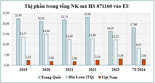 Biểu đồ 3: So sánh biến động thị phần của nhóm hàng HS 871160 nhập khẩu vào EU-27 từ Việt Nam, Trung Quốc, Đài Loan(TQ) giai đoạn 2019-2024