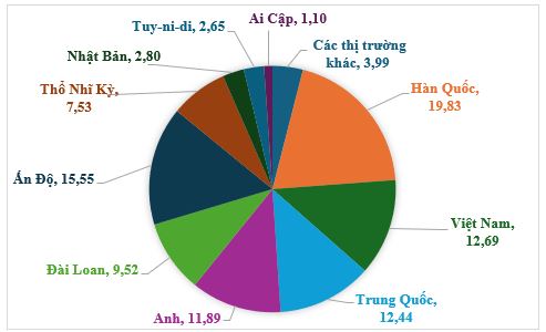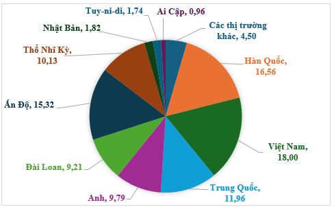 6 tháng đầu năm 2023, Hàn Quốc dẫn đầu khi chiếm 19,83% tổng thị phần toàn ngành trong khi Ấn Độ xếp thứ hai với thị phần là 15,55%. Sang đến đầu năm nay, thị phần của các quốc gia xuất khẩu không có nhiều sự biến động đáng kể. Thị phần của Việt Nam tăng mạnh lên hơn 18% và vươn lên chiếm vị trí dẫn đầu về thị phần. Thị phần của Hàn Quốc giảm mạnh chỉ còn 16,56% và xếp vị trí thứ 2. Ngoài Việt Nam, chỉ có Thổ Nhĩ Kỳ là tăng về thị phần lên đến 2,59% so với năm trước đó, đạt 10,13% tổng thị phần. Ngoại trừ Anh giảm 2,09%, các quốc gia còn lại đều giảm về thị phần ở mức từ 0,14% đến 0,98%.