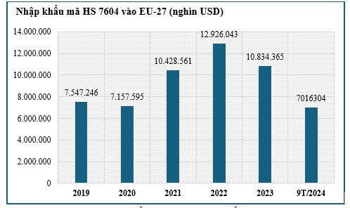 Biểu đồ 3: Biến động trị giá nhập khẩu mã HS 7604 từ Việt Nam vào EU-27 giai đoạn 2020-9T/2024