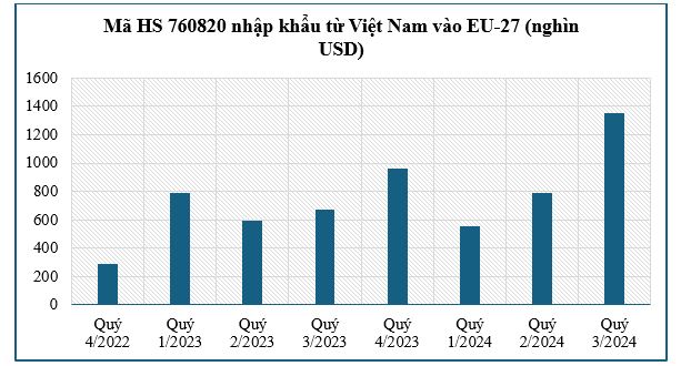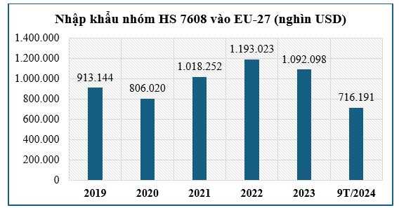 Năm 2024, cũng chỉ có khoảng hơn 2 triệu USD các lô hàng mã HS 7608 được nhập khẩu từ Việt Nam vào EU-27 trong 9 tháng đầu năm, tương đương khoảng 299 nghìn USD/tháng, tuy nhiên vẫn cao hơn so với mức 214,3 nghìn USD/tháng của năm 2023.