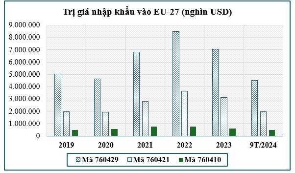 Theo số liệu của Trung tâm Thương mại quốc tế (ITC), giá trị nhập khẩu nhóm hàng nhôm mã HS 7604 vào EU-27 từ tất cả các thị trường trên thế giới sau khi giảm trong năm 2020 vì dịch bệnh đã liên tục tăng trong năm 2021-2022. Đến năm 2023, trị giá nhập khẩu nhóm hàng này đạt 10,83 tỷ USD, giảm 16,18% so với năm 2022 vì sức mua giảm chung trên toàn cầu.