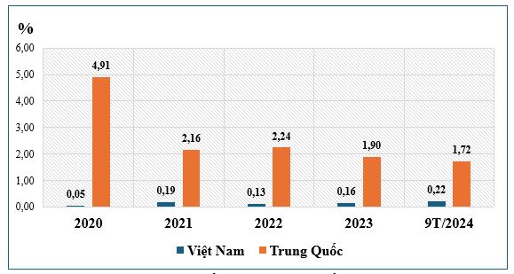 Tuy nhiên, nếu so với mốc năm 2019 (năm trước dịch bệnh Covid-19) thì thị phần của Trung Quốc đã giảm nhiều từ mức 7,86% xuống còn 4,84% trong 9 tháng đầu năm nay, trong khi thị phần của Việt Nam lại tăng từ 0,17% lên 0,38%.