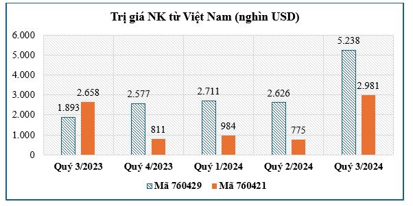 Biểu đồ 10: Biến động trị giá nhập khẩu mã HS 760820 từ Việt Nam vào EU-27 giai đoạn từ quý 3/2023-quý 3/2024