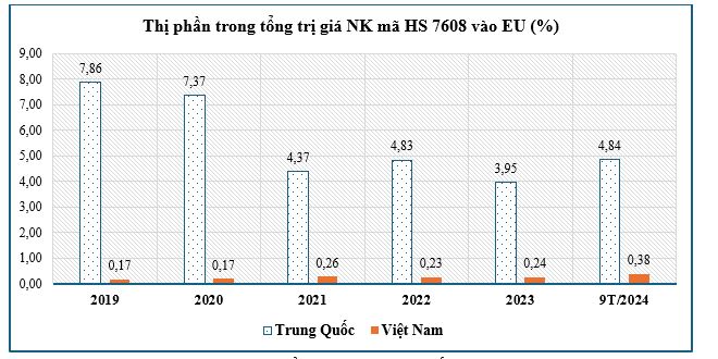 Đáng lưu ý là thị phần của nhóm hàng mã HS 7604 nhập khẩu từ Việt Nam trong tổng trị giá nhập khẩu vào EU-27 liên tục tăng trong giai đoạn 2020-2024 trong khi thị phần của hàng nhập khẩu từ Trung Quốc sụt giảm.
