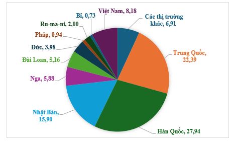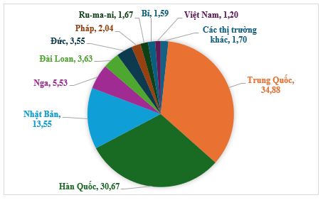 8 tháng đầu năm 2023, Trung Quốc dẫn đầu với thị phần lên đến 22,39%. Sang đến cùng kỳ năm 2024, thị phần của Trung Quốc có mức gia tăng cao lên đến 12,49%, giúp quốc gia này chiếm đến hơn một phần ba tổng thị phần (34,88%). Nhiều nguồn cung ứng bao gồm Nhật Bản, Nga, Đài Loan, Đức và Ru-ma-ni đều sụt giảm về thị phần giao động ở mức từ 0,35% đến 2,35%. Trong khi đó, Hàn Quốc, Pháp và Bỉ có mức tăng trong khoảng từ 0,85% đến 2,73%.
