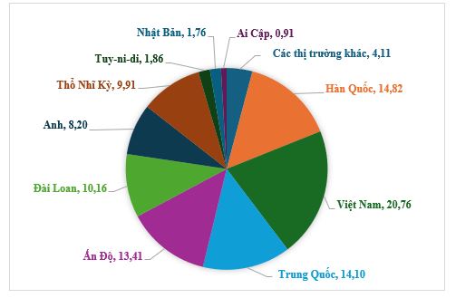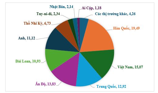 8 tháng đầu năm 2023, Hàn Quốc dẫn đầu với thị phần lên đến 19,49%. Sang đến cùng kỳ năm 2024, thị phần của Hàn Quốc có mức sụt giảm mạnh nhất lên đến 4,67% và giảm xuống chỉ chiếm 14,82% tổng thị phần. Trong 8 tháng đầu năm nay, thị phần cũng Việt Nam cũng tăng mạnh với mức tăng lên đến 5,69%, nâng thị phần của Việt Nam lên 20,76% và dẫn đầu trong Top 10. Ngoài Việt Nam, thị phần của Thổ Nhĩ Kỳ cũng gia tăng lên đến 3,17% so với cùng kỳ năm trước, đạt 9,91%.