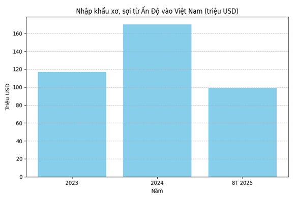 Thực tế, Việt Nam đã và đang nhập khẩu sợi và nguyên liệu dệt may từ Ấn Độ. Theo thống kê sơ bộ, trong 8 tháng đầu năm 2025, kim ngạch nhập khẩu nguyên liệu ngành dệt may của Việt Nam từ Ấn Độ (bao gồm xơ, sợi, vải và phụ liệu) đạt khoảng 280 triệu USD, tăng khoảng 12% so với cùng kỳ năm 2024. Đây đều là những mức tăng trưởng cao, phản ánh tiềm năng mở rộng thương mại song phương trong chuỗi cung ứng ngành dệt may.