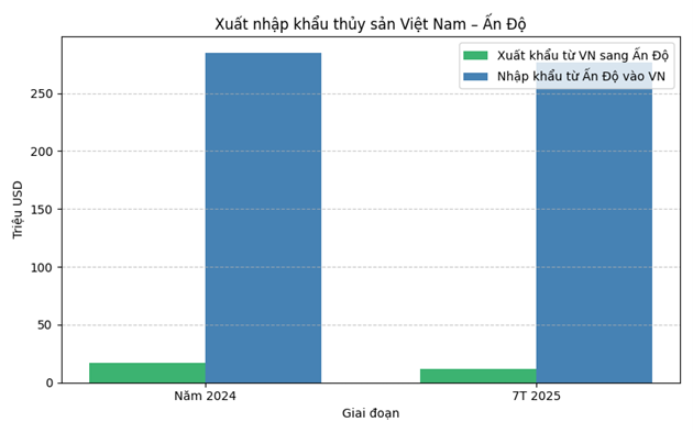 Theo số liệu từ Hải quan Việt Nam, 7 tháng đầu năm 2025, kim ngạch xuất khẩu hàng thủy sản của Việt Nam sang Ấn Độ đạt 11,4 triệu USD, chủ yếu là cá tra đông lạnh và một số sản phẩm cá biển. Ở chiều ngược lại, Việt Nam nhập khẩu 276,6 triệu USD kim ngạch mặt hàng thủy sản từ Ấn Độ (đặc biệt là tôm và cá nguyên liệu) để phục vụ chế biến xuất khẩu sang các thị trường lớn như EU, Mỹ và Nhật Bản.
