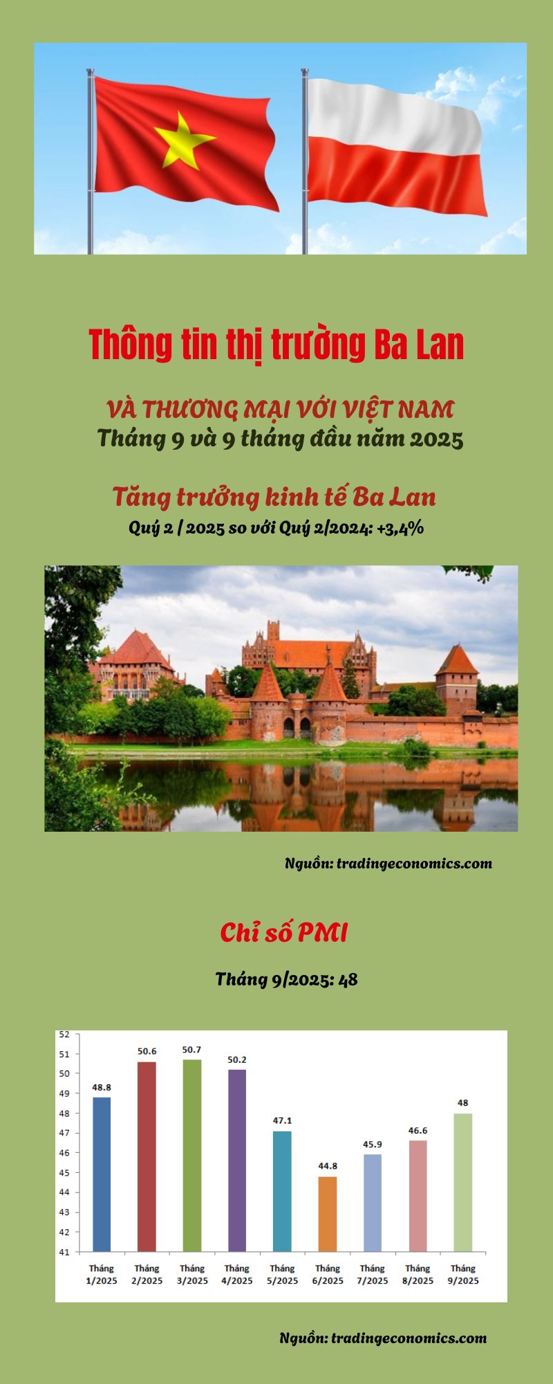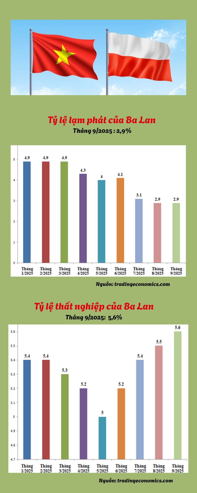 Theo số liệu của tradingeconomic.com, tăng trưởng kinh tế của Ba Lan đạt 3,4% trong quý 2/2025, tỷ lệ lạm phát 2,9% trong tháng 9/2025, duy trì là mức thấp nhất kể từ tháng 6 năm 2024, trong khi chỉ số PMI sản xuất của Ba Lan trong tháng 9/2025 tăng và đạt 48,0.