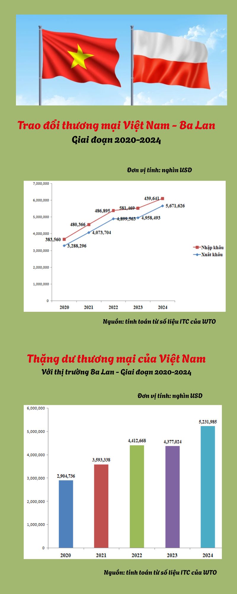 Xuất khẩu hàng hóa của Việt Nam sang thị trường Ba Lan năm 2024 đạt 5,67 tỉ USD, tăng 42% so với mức gần 3,29 tỉ USD năm 2020. Trong khi đó, nhập khẩu hàng hóa của Việt Nam từ thị trường Ba Lan năm 2024 đạt trên 439.641 USD, tăng gần 12,8% so với mức gần 383,56 triệu USD năm 2020.