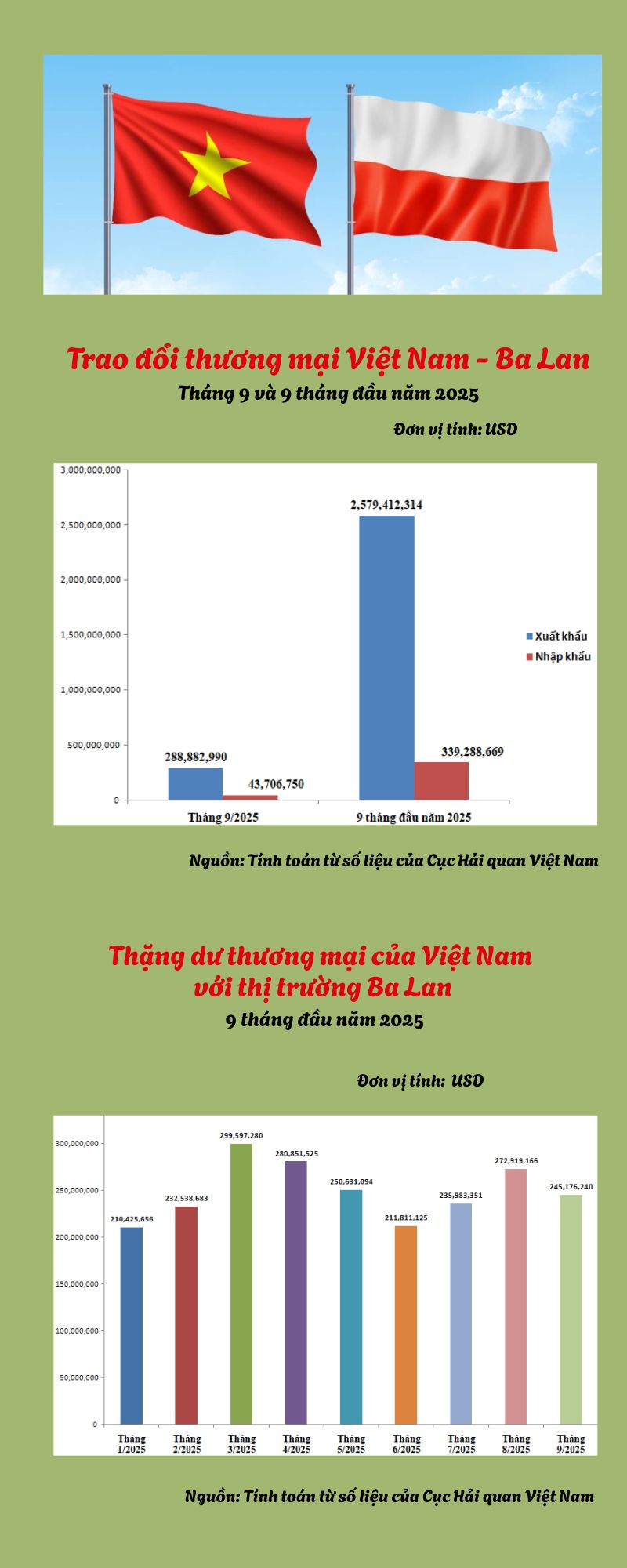 Theo số liệu thống kê của Cục Hải quan Việt Nam, 9 tháng đầu năm 2025, trao đổi thương mại 2 chiều giữa Việt Nam và Ba Lan đạt hơn 2,9 tỉ USD, trong đó xuất khẩu của Việt Nam sang Ba Lan đạt gần 2,58 tỉ USD, và nhập khẩu hàng hóa của Việt Nam từ Ba Lan đạt trên 339 triệu USD, Việt Nam đạt thặng dư 2,24 tỉ USD.