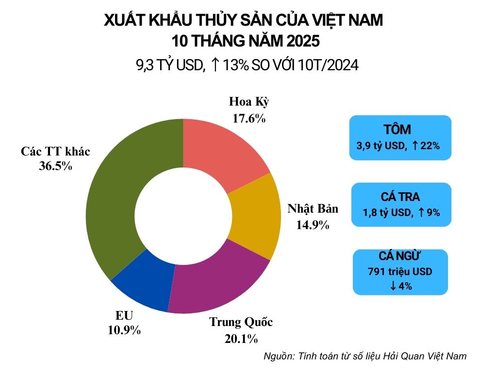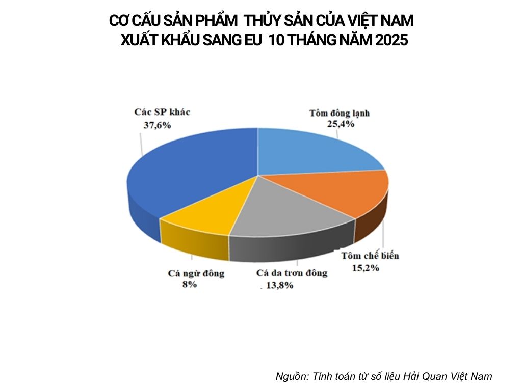 Theo số liệu của Cục hải quan Việt Nam, trong 10 tháng năm 2025, xuất khẩu thủy đạt 9,32 tỷ USD, tăng 13,07% so với cùng kỳ năm trước. Trong đó, xuất khẩu sang thị trường EU đạt đạt 1,01 tỷ USD, tăng 11,2% so với cùng kỳ 2024, chiếm 10,9% trong tổng kim ngạch xuất khẩu thủy sản của Việt Nam.