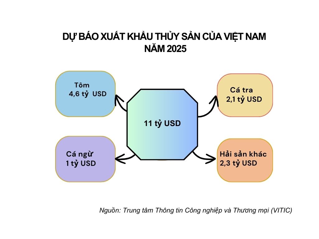 Năm 2025, xuất khẩu thủy sản sang các thị trường có xu hướng tích cực hơn về nhu cầu cũng như giá cả phục hồi dần. Dự báo xuất khẩu thủy sản năm 2025 có thể đạt khoảng 11 tỷ USD. Trong đó, tôm kỳ vọng 4,6 tỷ USD, cá tra 2,1 tỷ USD, và các hải sản khác đóng góp 3,3 tỷ USD.