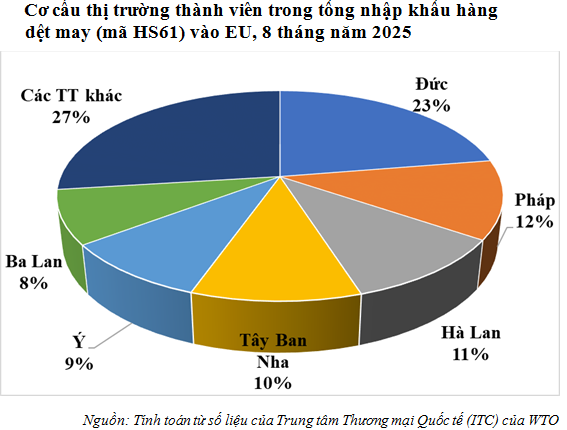 Trong số các đối tác thành viên trong EVFTA, trong tháng 10/2025, Việt Nam xuất hàng dệt may nhiều nhất sang các thị trường: Hà Lan (đạt gần 129,13 triệu USD), Đức (đạt trên 73,93 triệu USD), Tây Ban Nha (đạt gần 44,27 triệu USD), Pháp (đạt gần 44,2 triệu USD).