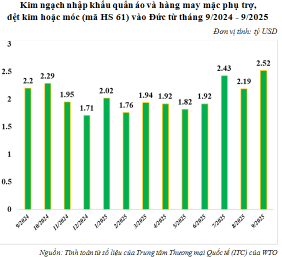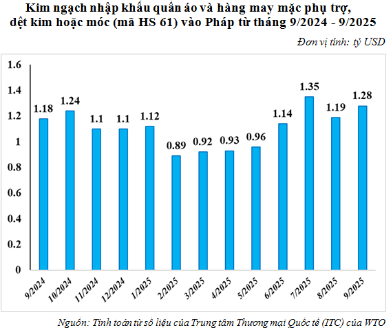 Theo tính toán từ số liệu thống kê hải quan của Việt Nam, xuất khẩu hàng dệt may của Việt Nam sang EU tháng 10/2025 tăng 1,7% so với tháng 9/2025 nhưng giảm 2,85% so với tháng 10/2024, đạt trên 386,17 triệu USD. Tính chung 10 tháng năm 2025 xuất khẩu hàng dệt may sang EU giảm 2,51% so với cùng kỳ năm 2024, đạt gần 3,94 tỷ USD.
