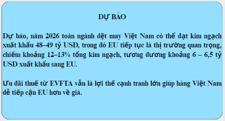 Xuất khẩu hàng dệt may của Việt Nam sang các thị trường trên thế giới 10 tháng năm 2025 đạt trên 32,93 tỷ USD, tăng 7,72% so với cùng kỳ năm 2024, trong đó xuất khẩu sang EU chiếm 11,95% trong tổng kim ngạch. Hiệp định EVFTA đang mở ra một “cánh cửa thứ hai” giúp ngành dệt may Việt Nam tiếp cận thị trường EU, đồng thời hướng đến mô hình sản xuất xanh và bền vững hơn theo tiêu chuẩn châu Âu.