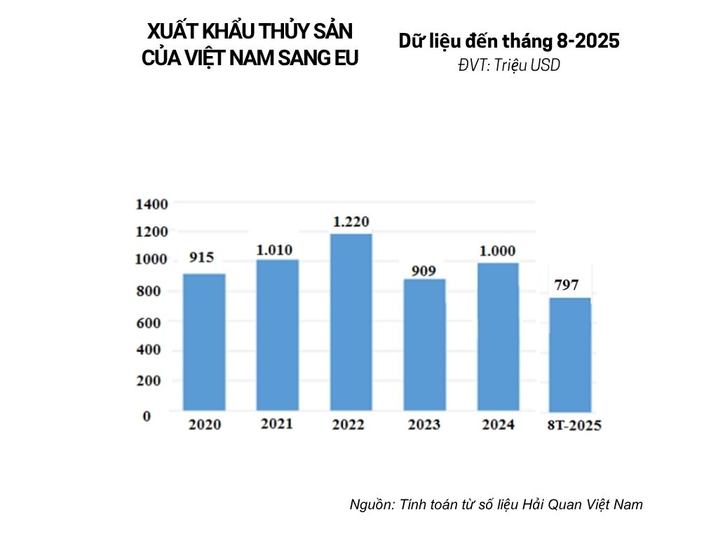 Theo số liệu của Cục hải quan Việt Nam, trong 8 tháng đầu năm 2025, xuất khẩu thủy sản đạt 7,2 tỷ USD, tăng 13,4% so với cùng kỳ năm trước. Trong đó, xuất khẩu sang thị trường EU đạt 797,9 triệu USD, tăng 23% so với cùng kỳ 2024, chiếm 11,1% trong tổng kim ngạch xuất khẩu thủy sản của Việt Nam.