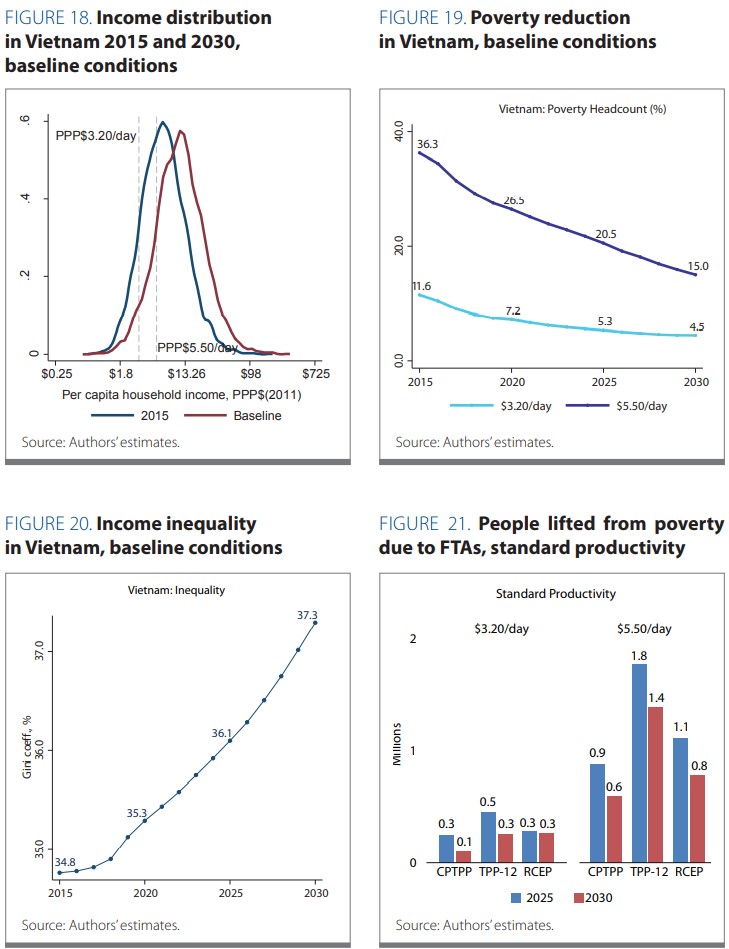 Những người ở các nhóm cao trong phân phối thu nhập được hưởng lợi nhiều hơn so với người nghèo, vì hiệp định tạo ra nhiều cơ hội kinh tế hơn cho lao động có kỹ năng. Các Hình 22 và Hình 23 dưới đây mô tả đường cong tỉ lệ tăng trưởng so với kịch bản cơ sở của từng FTA. Các đường đồ thị chỉ ra mức tăng tuyệt đối về thu nhập đầu người so với kịch bản cơ sở ở từng nhóm phân vị trong phân phối thu nhập. Hình 22 ở phía bên phải biểu diễn các đường đồ thị với các giả định bình thường về năng suất, và thấp hơn nhiều so với Hình 23 ở phía trái, trong đó biểu diễn các đường cong tỉ lệ tăng trưởng với giả định kích thích tăng năng suất. Mức tăng biểu thị trên đường cong tỉ lệ tăng trưởng có được từ mô phỏng vi mô với số liệu Điều tra Mức sống Hộ gia đình Việt Nam (2012). Mô phỏng vi mô có đưa vào các cú sốc về kinh tế vĩ mô của từng FTA, và mô phỏng tác động đối với a) tái phân bổ lao động trong từng ngành, b) thay đổi mức lương tương đối, c) thay đổi mức tiêu dùng của hộ gia đình.