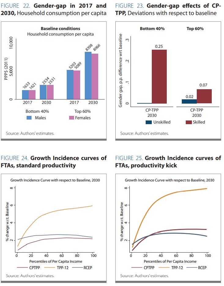 Mặc dù TPP-12 và CPTPP có những tác động tích cực lớn hơn so với RCEP, nhưng tính bình quân, hai hiệp định này vẫn cho mức tăng thu nhập tương đối cao hơn cho các đối tượng ở nhóm 60% dân số thu nhập cao so với 40% dân số thu nhập thấp. Ngược lại, RCEP theo giả định sẽ dẫn tới sự phát triển của những ngành có mức độ tập trung lao động lớn hơn ở nhóm 40% thu nhập thấp trong phân bổ thu nhập, gồm cả nông nghiệp và thực phẩm. Nếu kết quả cuối cùng của RCEP phù hợp với các tính toán trên, những lợi ích mà hiệp định này đem lại cho người nghèo sẽ lớn hơn tương đối so với CPTPP hay TPP-12.